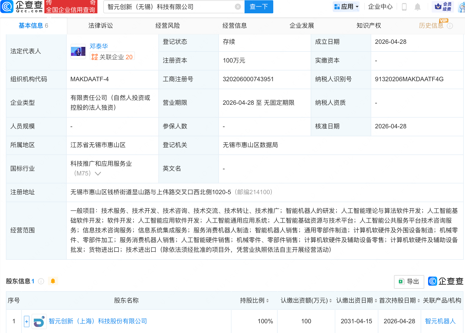 企查查APP显示,近日,智元创新(无锡)科技有限公司成立,经营范围包含:人工智能应用软件开发;人工智能通用应用系统;人工智能基础资源与技术平台;人工智能公共服务平台技术咨询服务等。企查查股权穿透显示,该公司由智元机器人关联公司智元创新(上海)科技股份有限公司全资持股。