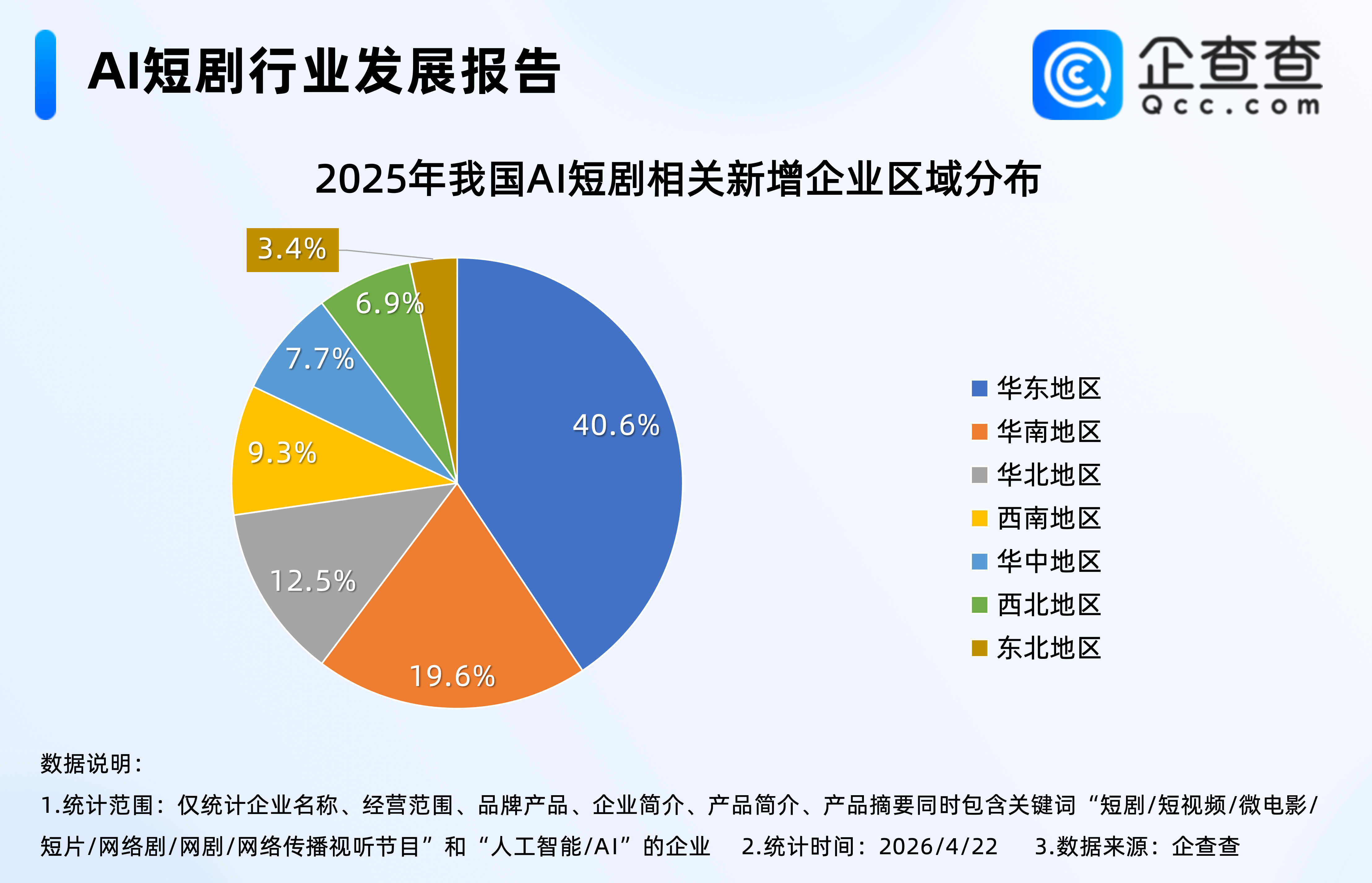 企查查数据显示,2025年注册的5465家AI短剧相关企业中,分布在华东地区的相关企业最多,占比40.6%,其次是华南地区,占比19.6%,西北、东北地区相对较少,分别占比6.9%、3.4%。