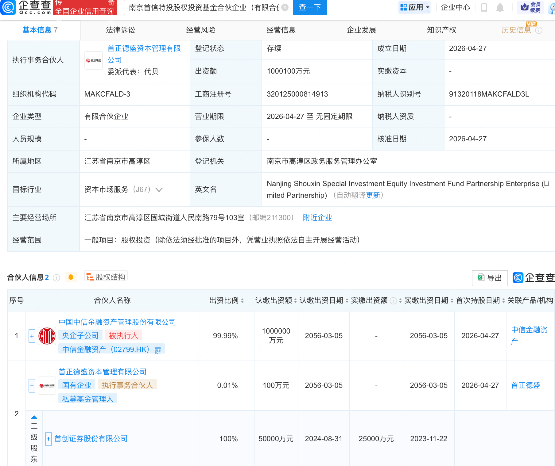 企查查APP显示,近日,南京首信特投股权投资基金合伙企业(有限合伙)成立,出资额约100亿元,经营范围包含:股权投资。企查查股权穿透显示,该公司由中信金融资产(02799.HK)、首创证券(601136)全资子公司首正德盛资本管理有限公司共同出资。