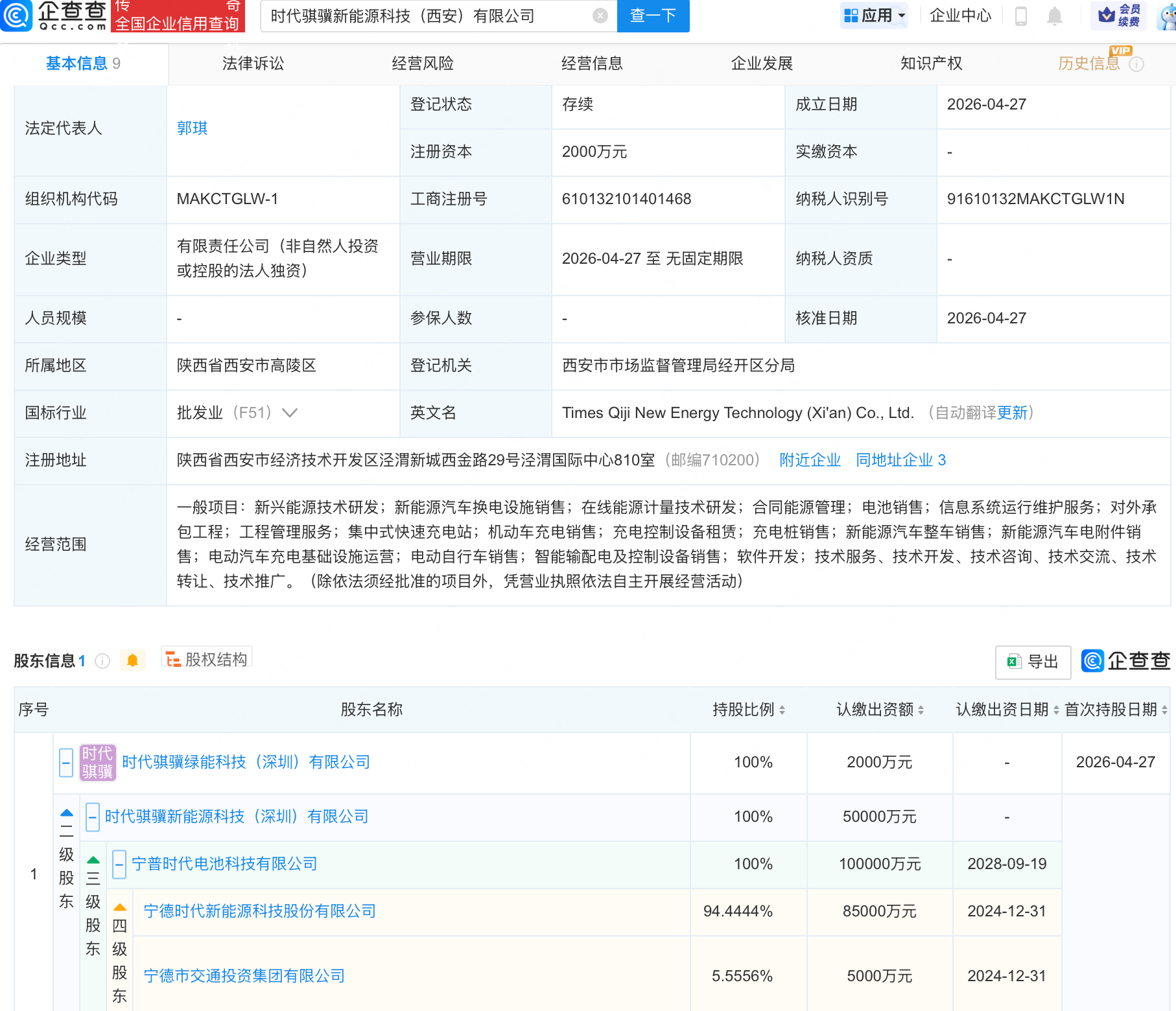 企查查APP显示,近日,时代骐骥新能源科技(西安)有限公司成立,经营范围包含:机动车充电销售;充电控制设备租赁;充电桩销售;新能源汽车整车销售等。企查查股权穿透显示,该公司由宁德时代(300750)旗下时代骐骥绿能科技(深圳)有限公司全资持股。