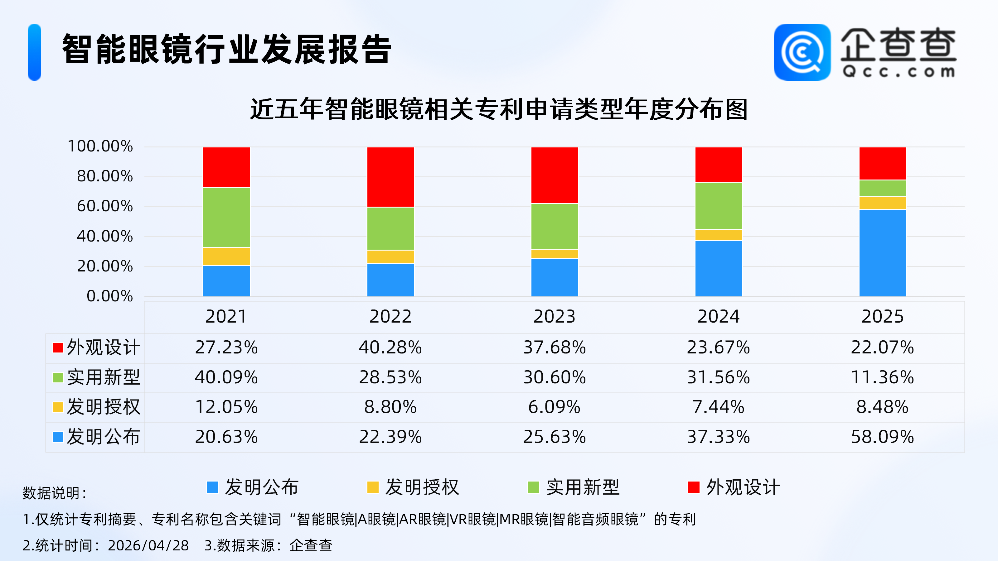 企查查数据显示,截至4月28日,国内现存智能眼镜相关专利1.77万项。近十年我国智能眼镜相关专利量呈稳定上升趋势,2016年年末相关专利存量仅0.15万项,随后逐年稳步增长,2025年末已达1.76万项,较十年前增长超10倍。从申请专利类型的年度分布来看,发明公布专利占比大幅跃升,从2021年的20.63%增长至2025年的58.09%。