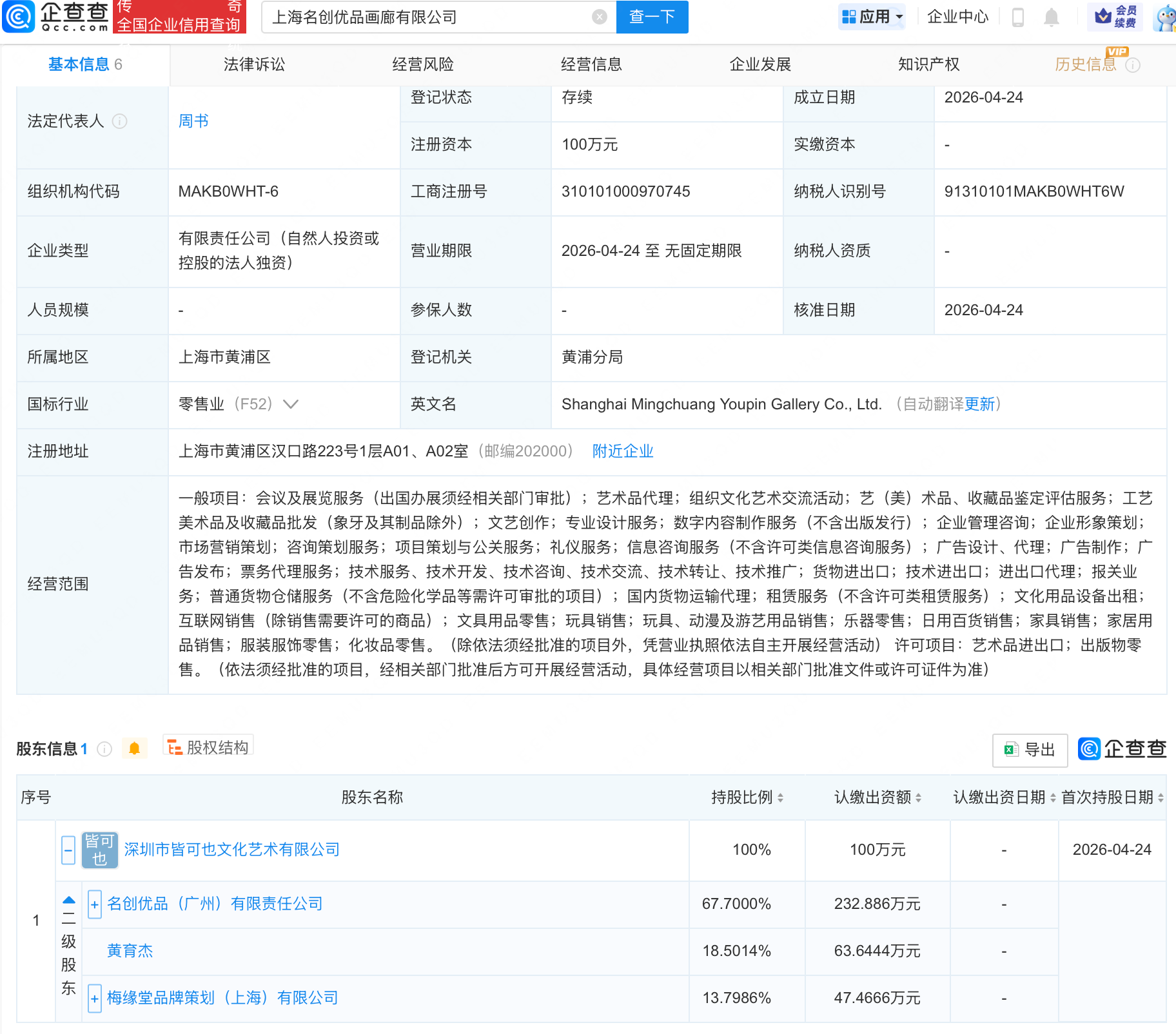 企查查APP显示,近日,上海名创优品画廊有限公司成立,经营范围包含:艺(美)术品、收藏品鉴定评估服务;工艺美术品及收藏品批发(象牙及其制品除外);文艺创作;专业设计服务;数字内容制作服务(不含出版发行)等。企查查股权穿透显示,该公司由名创优品(广州)有限责任公司旗下深圳市皆可也文化艺术有限公司全资持股。
