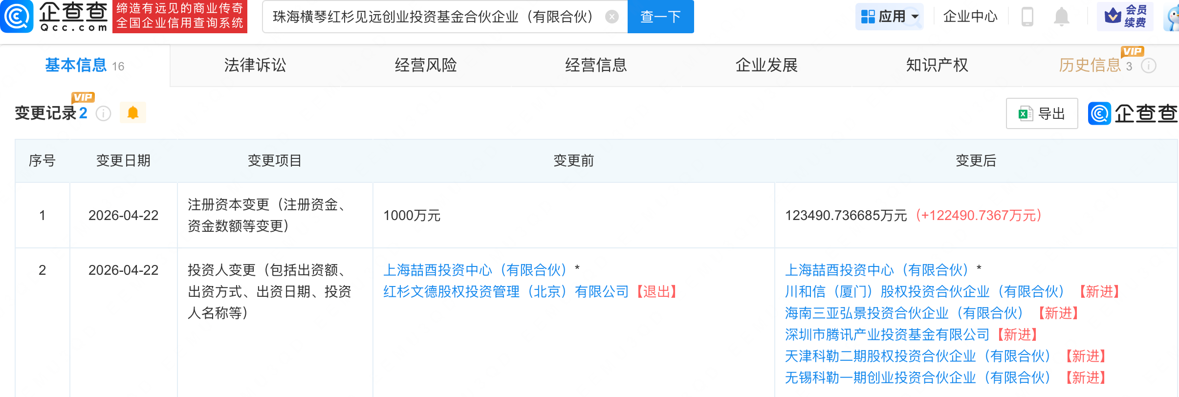 企查查APP显示,近日,珠海横琴红杉见远创业投资基金合伙企业(有限合伙)发生工商变更,新增深圳市腾讯产业投资基金有限公司等为合伙人,同时出资额由1000万元增至约12.35亿元。企查查信息显示,该企业成立于2025年,经营范围包含:以私募基金从事股权投资、投资管理、资产管理等活动。