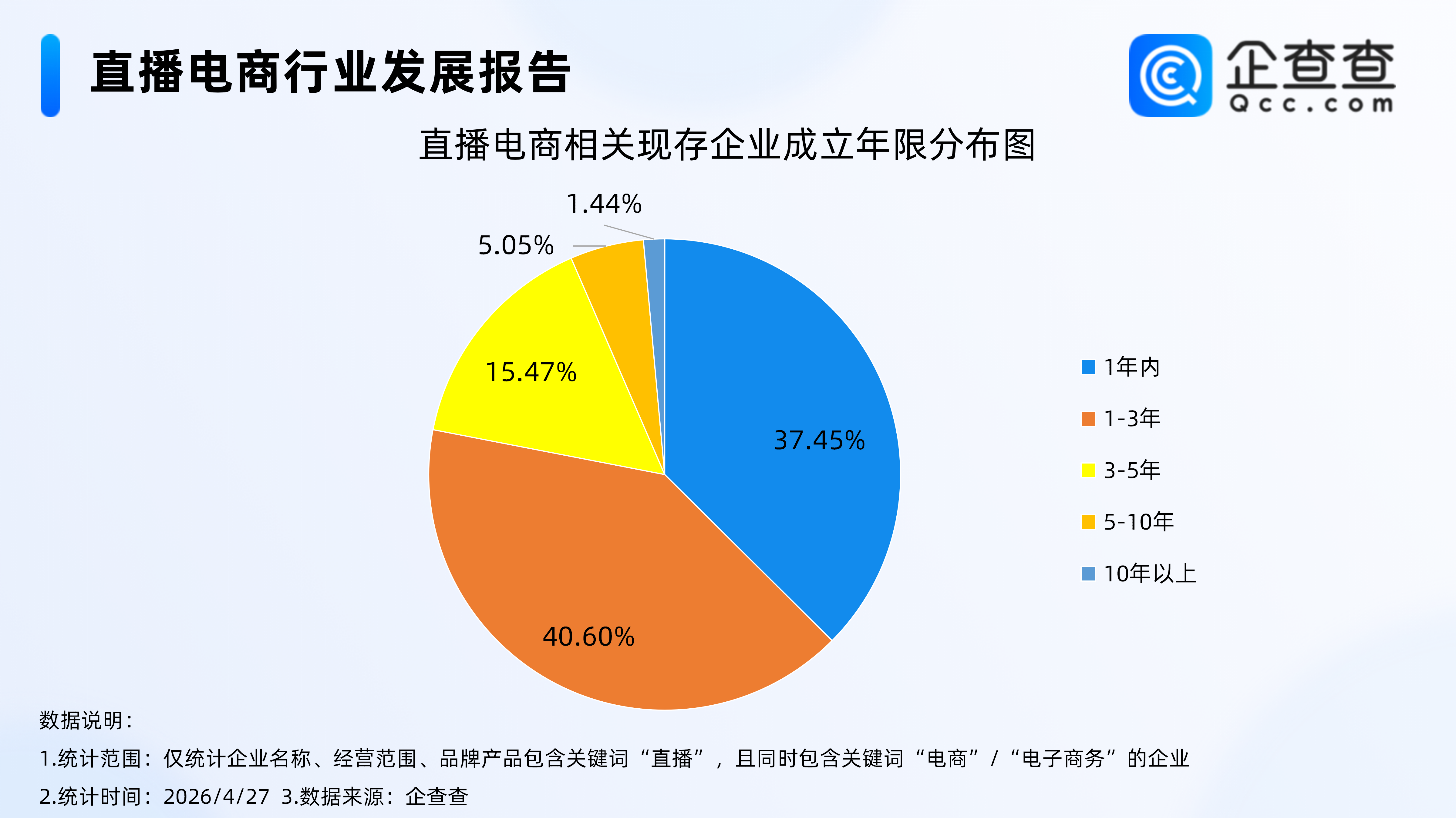企查查数据显示,成立年限分布上,直播电商相关现存企业普遍呈现年轻化特征,近8成相关企业成立3年内,其中成立年限在1-3年的企业占比最高,达40.60%,成立1年内的相关企业占比37.45%;成立10年以上的企业占比最低,仅为1.44%。行业年轻化结构与直播电商近年来的快速崛起高度吻合,大量企业随行业浪潮集中涌现,市场仍处于快速扩容阶段。