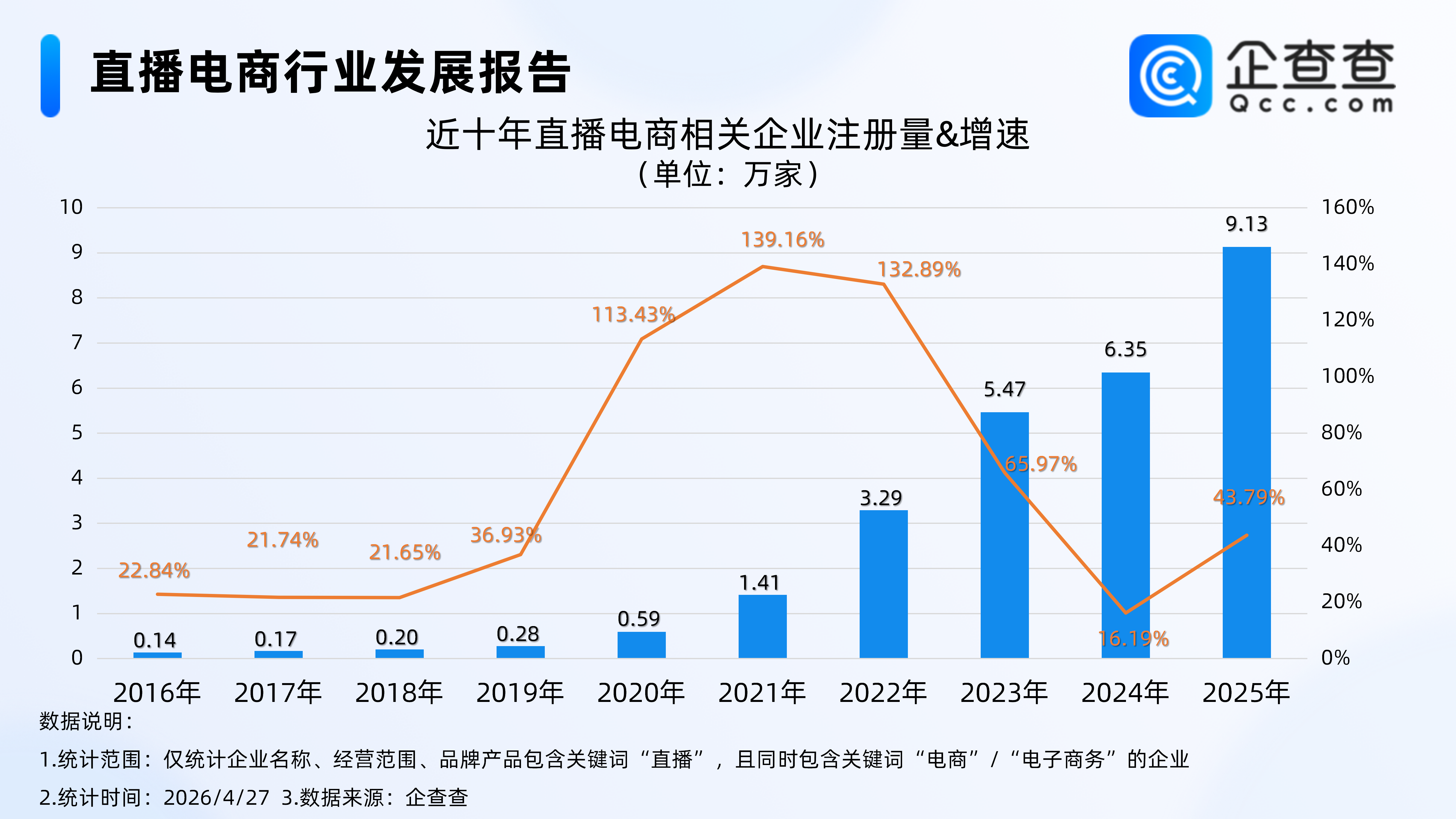 企查查数据显示,近十年直播电商相关企业注册量整体呈快速增长趋势。2016年相关企业年注册量仅为0.14万家,2020年起,直播电商相关企业注册量加速增长,2020年注册量同比增长113.43%至0.59万家,2021年注册量同比增长139.16%至1.41万家,达近十年注册增速峰值;此后注册量持续高位扩张,2022年、2023年分别达3.29万家、5.47万家;2025年注册量同比增长43.79%至9.13万家,创近十年注册量新高。截至目前,今年已注册2.81万家相关企业。