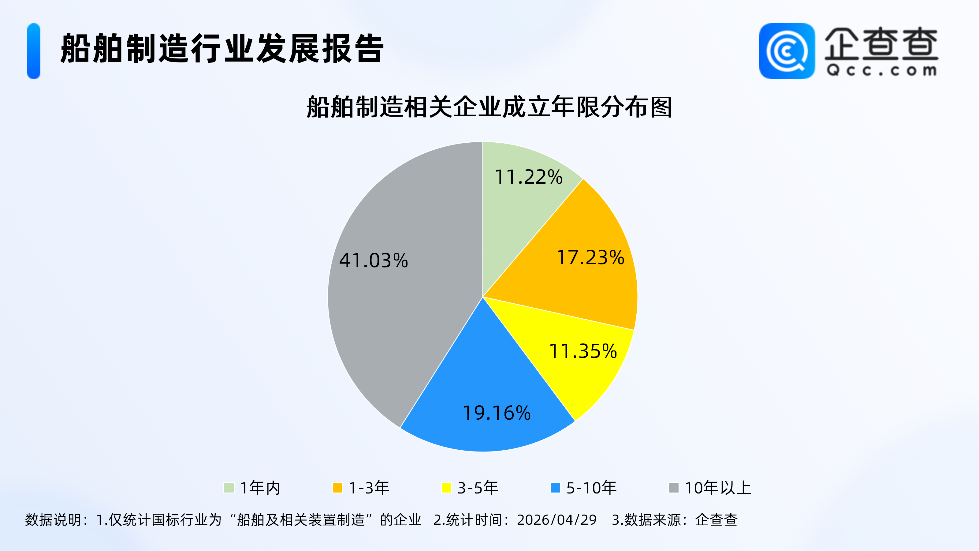 企查查数据显示,截至4月30日,国内现存船舶制造相关企业2.18万家。近十年船舶制造相关企业年末存量呈持续增长态势,从2016年末的1.60万家增至2025年末的2.14万家。从成立年限分布看,现存船舶制造相关企业多以成熟企业为主。成立10年以上的企业占比最高,达41.03%。注册量方面,近十年船舶制造相关企业注册量整体呈增长态势,从2016年的1280家升至2025年的2557家。截至目前,今年已注册773家相关企业。
