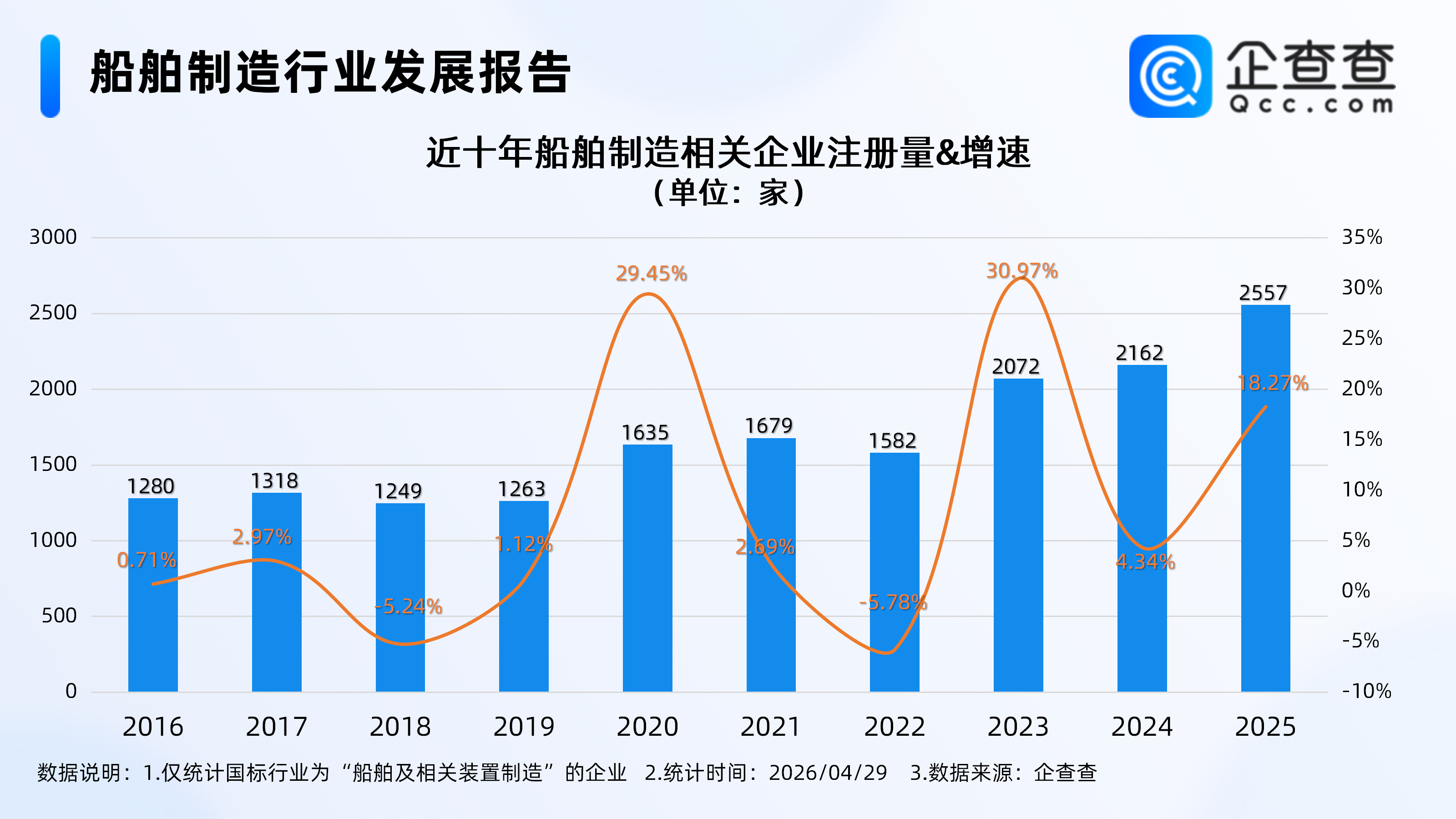 企查查数据显示,注册量方面,近十年船舶制造相关企业注册量整体呈增长态势,从2016年的1280家升至2025年的2557家。其中,2025年注册量达近十年新高,同比增速回升至18.27%。截至目前,今年已注册773家相关企业。