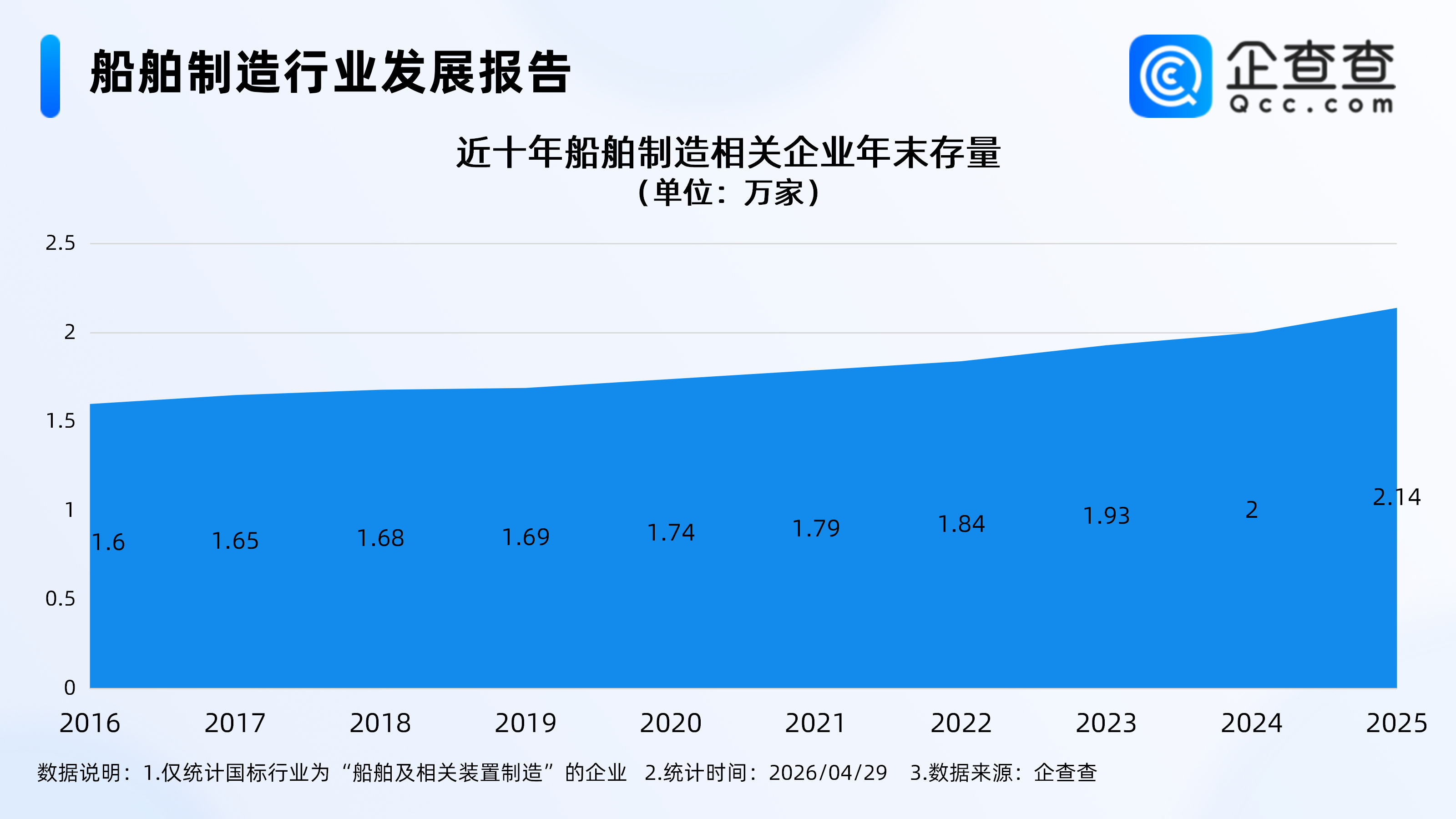 企查查数据显示,截至4月30日,国内现存船舶制造相关企业2.18万家。近十年船舶制造相关企业年末存量呈持续增长态势,从2016年末的1.60万家增至2025年末的2.14万家,增幅约33.75%。2016-2019年行业扩容节奏平缓;2020年起增长提速,2023-2025年企业存量连续突破1.9万、2.0万、2.1万关口。