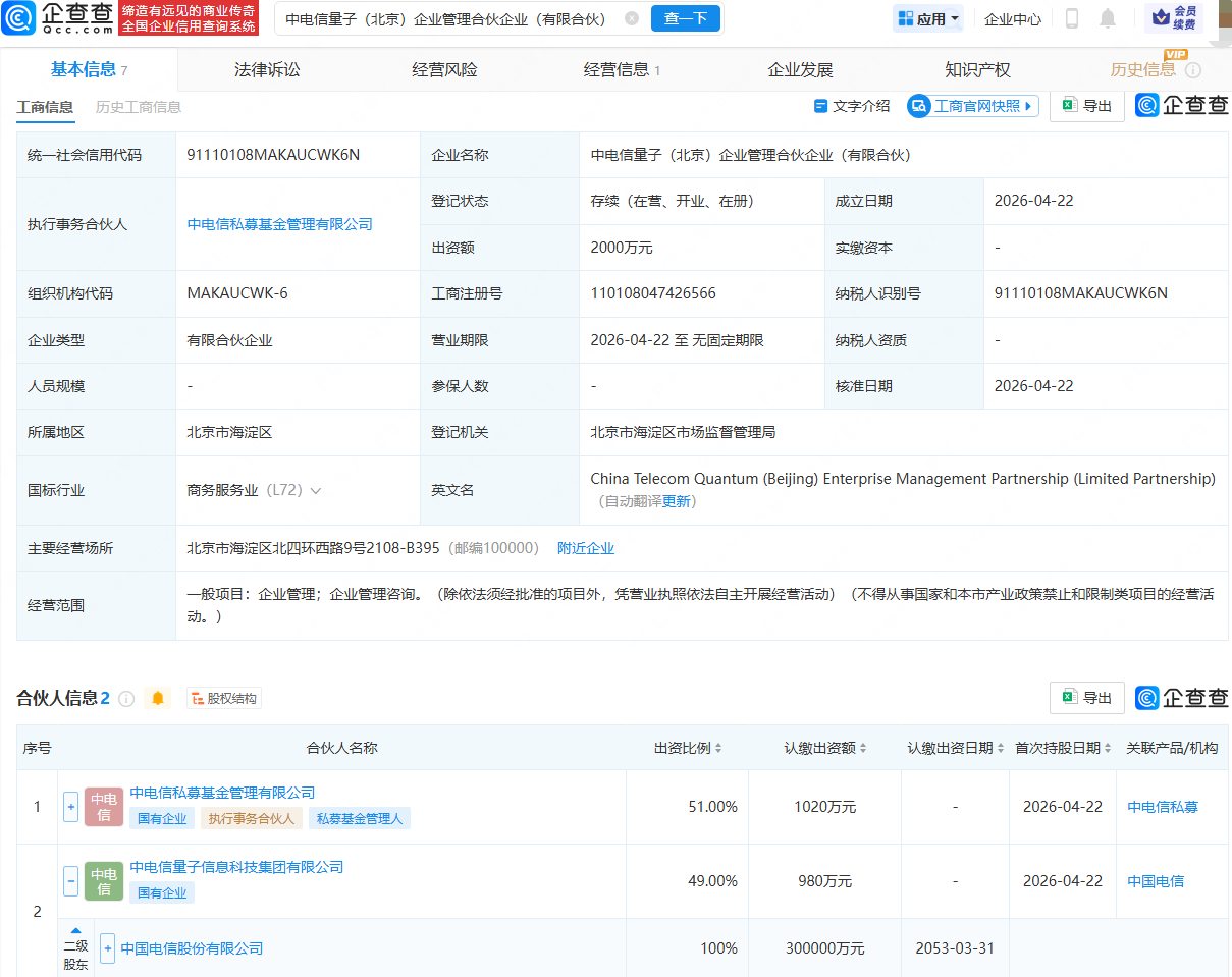 企查查APP显示,近日,中电信量子(北京)企业管理合伙企业(有限合伙)成立,出资额2000万元,经营范围包含:企业管理;企业管理咨询。企查查股权穿透显示,该合伙企业由中电信私募基金管理有限公司、中国电信(601728)全资子公司中电信量子信息科技集团有限公司共同持股。
